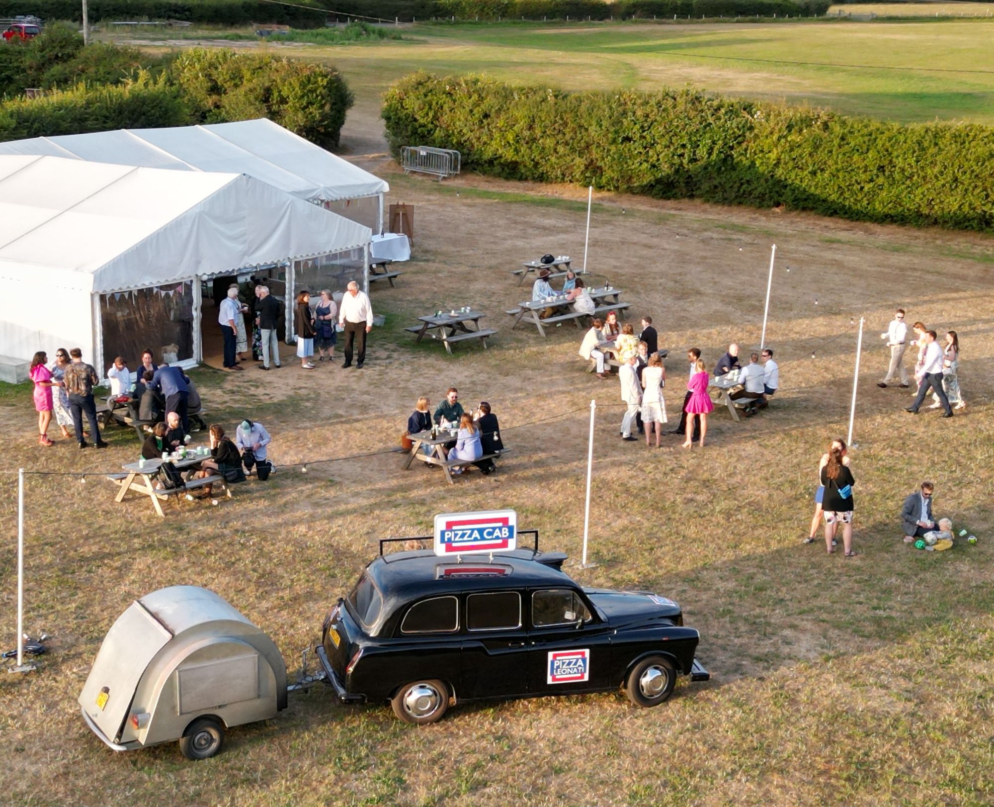 The black taxi photographs beautifully and becomes part of the atmosphere. It feels premium, unique, and unmistakably different from standard Sussex pizza vans.